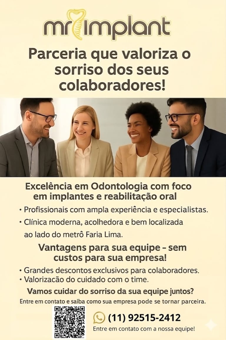 Na Mr Implant, a idéia é de fato promover uma parceria genuína entre empresa e colaborador . A dor e a falta de dentes são uns dos maiores causadores de faltas ao trabalho . Com essas parcerias , conseguimos proporcionar ao funcionário um valor realmente acessível para repor seus dentes com qualidade ! Venha fazer parte da Mr Implant ! Consulte condições .
